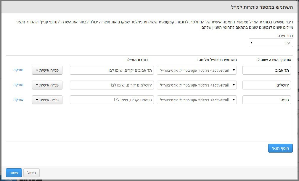 אתם יכולים לדוגמה, לחלק את רשימת התפוצה לערים, כשלכל עיר כותרת נפרדת, אישית יותר, כפי שניתן לראות בתמונה: