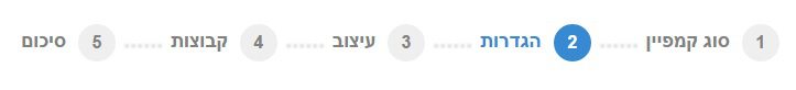 תהליך יצירת קמפיין דיוור באקטיב טרייל מורכב מחמישה שלבים: סוג קמפיין, הגדרות, עיצוב, קבוצות וסיכום.