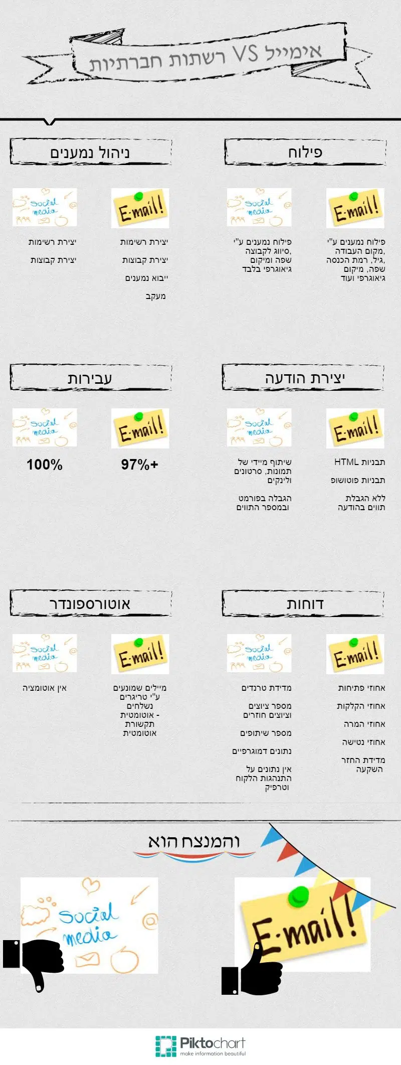 בדקנו כמה פרמטרים חשובים בשיווק אונליין, כמו ניהול רשימות תפוצה, רמת עבירות ופיצ’רים נוספים וגילינו, שהאימייל נותר חזק כשהיה. היווכחו בעצמכם.